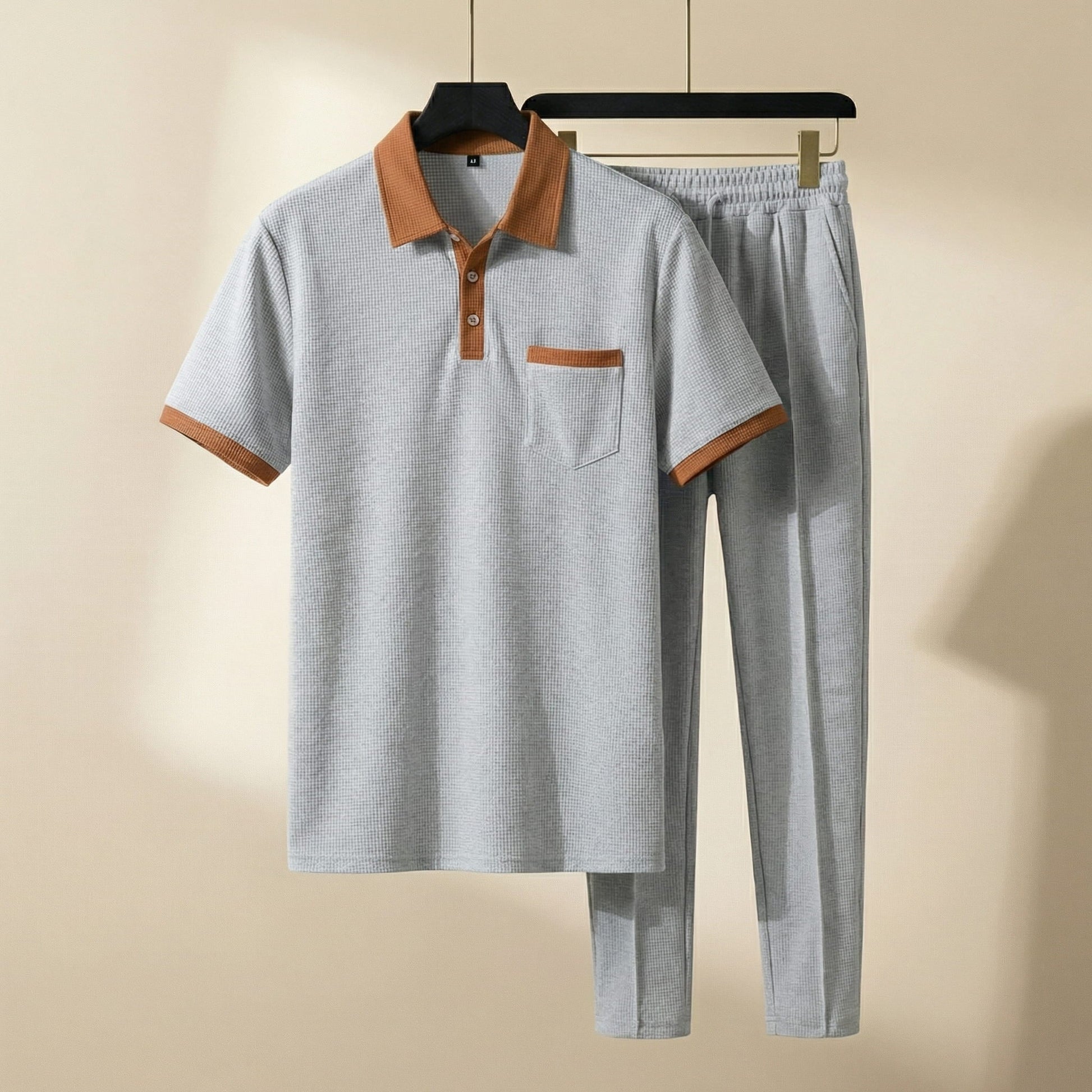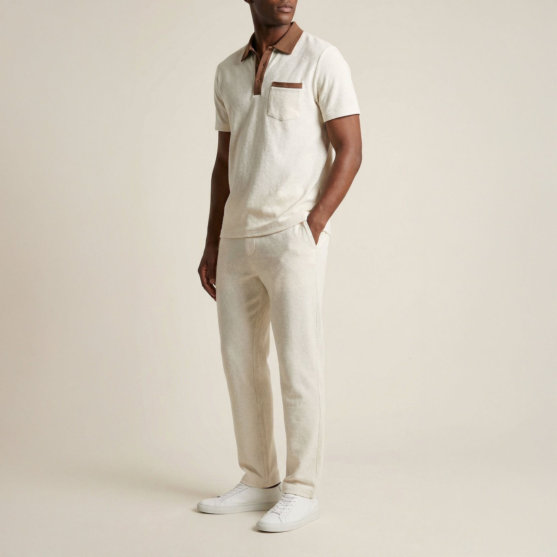 Crafted from a premium cotton-blend knit, this coordinated set feels soft, breathable, and gently substantial against the skin while maintaining a clean, dry touch throughout the day. Designed to balance comfort with structure, its refined polo silhouette, muted contrast trims, and matching trousers create an intentional, grown-up look suited to calm mornings, quiet evenings, and relaxed time at home—nothing added, nothing overstated.